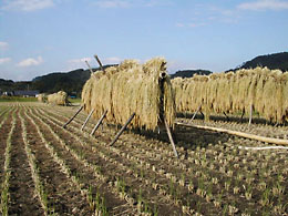 | お米の作業 | 機械植えのお米の稲刈り、ハゼがけ(天日干し) |