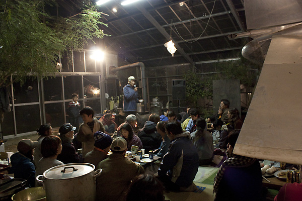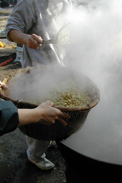 真冬の白州で毎年恒例の味噌仕込み。朝早くから大釜で大豆を煮はじめます。参加希望の方は、前日からの白州入りをおすすめいたします。